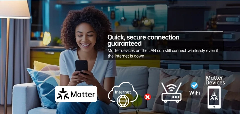 Offline control: Matter devices can seamlessly communicate and control each other on the local network without an internet connection. Alternatively, Your smartphone and smart device must be on the same Wi-Fi network. Szkoston