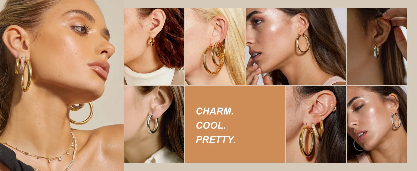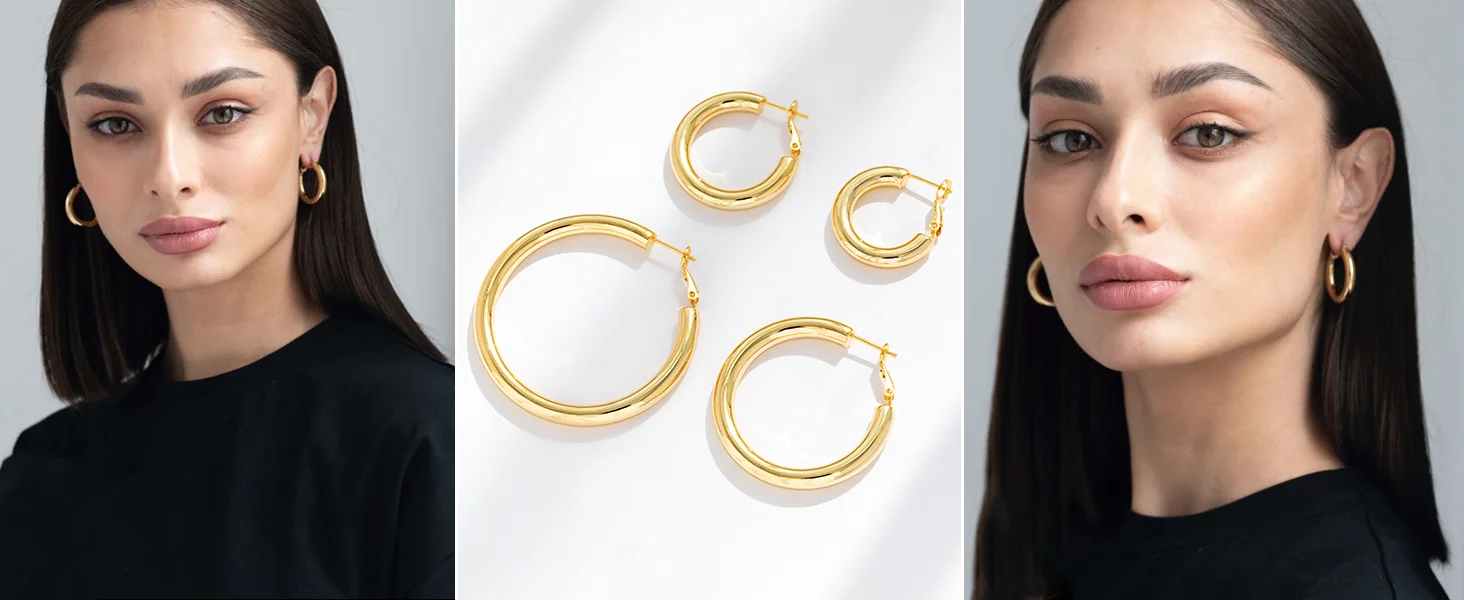Premium Quality Chunky Hoop Earrings: the gold thick hoop earrings are made of quality copper, with 925 sterling silver post, 14k real gold plated, hypoallergenic, lead & nickel free. Won't irritate your sensitive skin. Shinny polished process, you deserve this gorgeous earring.